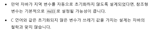 "지역변수가 필수적으로 초기화 기능이 개발자의 실수 방지와 잠재적 오류 방지 장치라면, 만약 '지역변수가 초기화 되어야한다고 설계되어 있지 않으면' int[] b를 System.out.println(b); 로 출력했을때 null값이 나오나, 아니면 C언어와 똑같이 쓰레기 값이 들어갈까 ?"