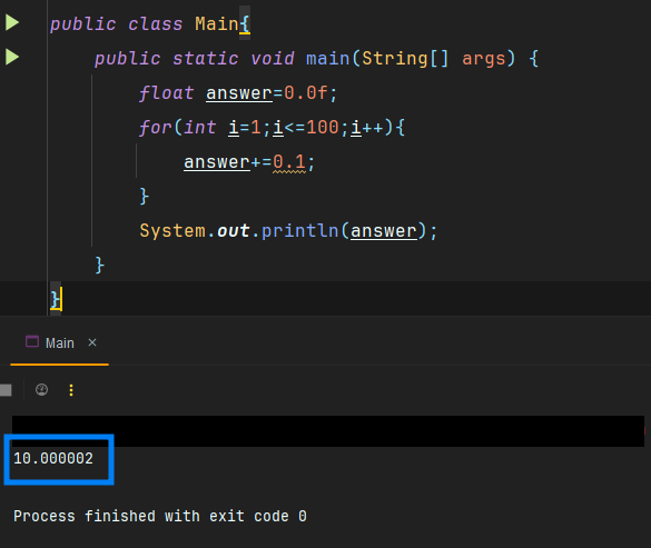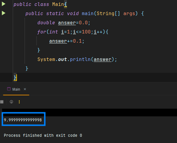 float 타입의 0.1을 100번 더해도 정확히 10이 나오지 않는 것을 확인할 수 있다.