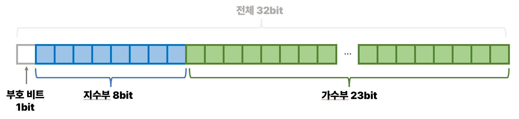 - 지수: 8bit (바이어스 127를 사용. 지수+127해서 2진수로 변환해야함)