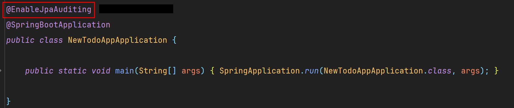 이에 @EnableJpaAuditing 어노테이션을 @SpringBootApplication이 선언된 클래스에 추가하였다.