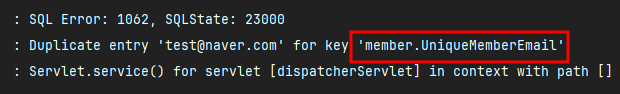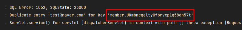 아까와 같이 중복된 email을 저장하는 오류를 낸 뒤 콘솔창을 확인하면,