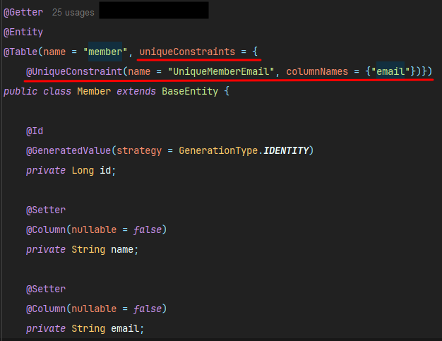 필자는 email 컬럼에만 unique 제약조건을 걸어보았다.