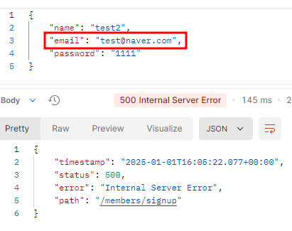 postman을 사용해서 일부러 중복되는 email을 저장해보았다.