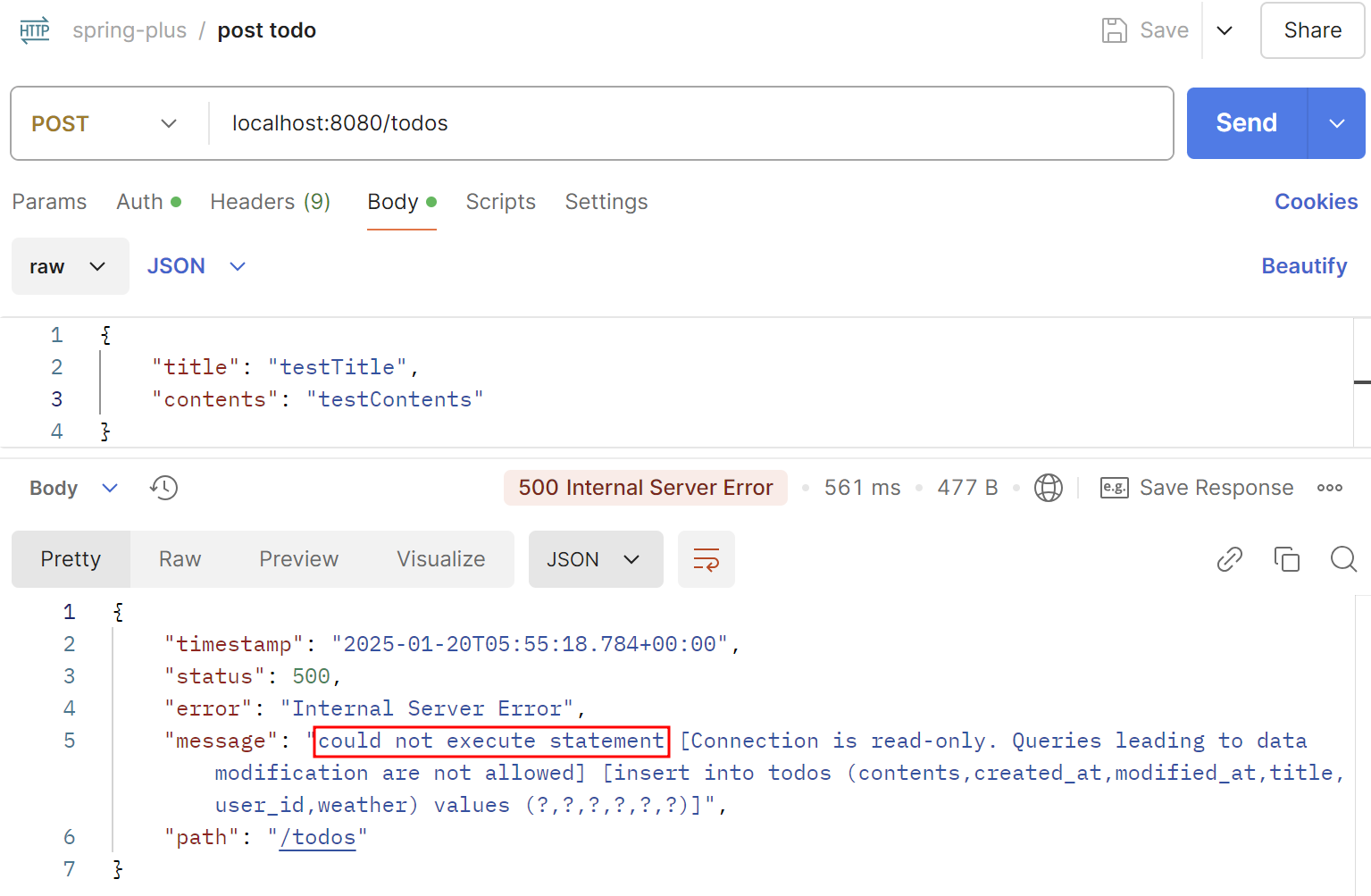jakarta.servlet.ServletException: Request processing failed: org.springframework.orm.jpa.JpaSystemException: could not execute statement [Connection is read-only. Queries leading to data modification are not allowed] [insert into todos (contents,created_at,modified_at,title,user_id,weather) values (?,?,?,?,?,?)] at org.springframework.web.servlet.FrameworkServlet.processRequest(FrameworkServlet.java:1022) ~[spring-webmvc-6.1.12.jar:6.1.12] at org.springframework.web.servlet.FrameworkServlet.doPost(FrameworkServlet.java:914) ~[spring-webmvc-6.1.12.jar:6.1.12]