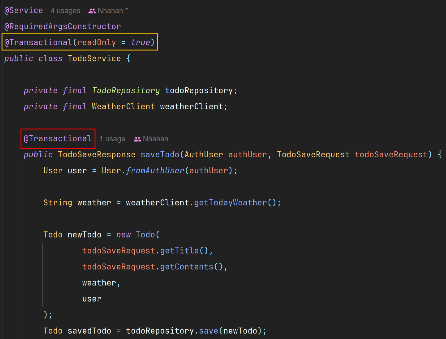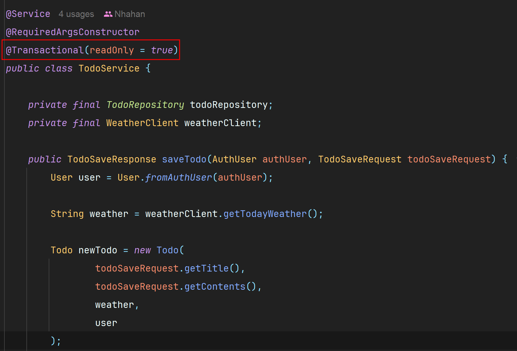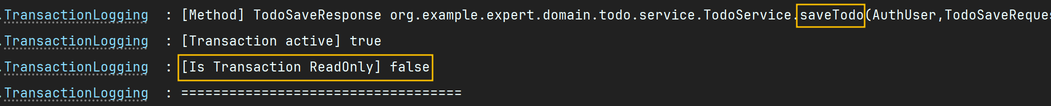 saveTodo()에도 따로 @Transactional을 추가하여 read-only속성이 false가 되도록 하였다.
