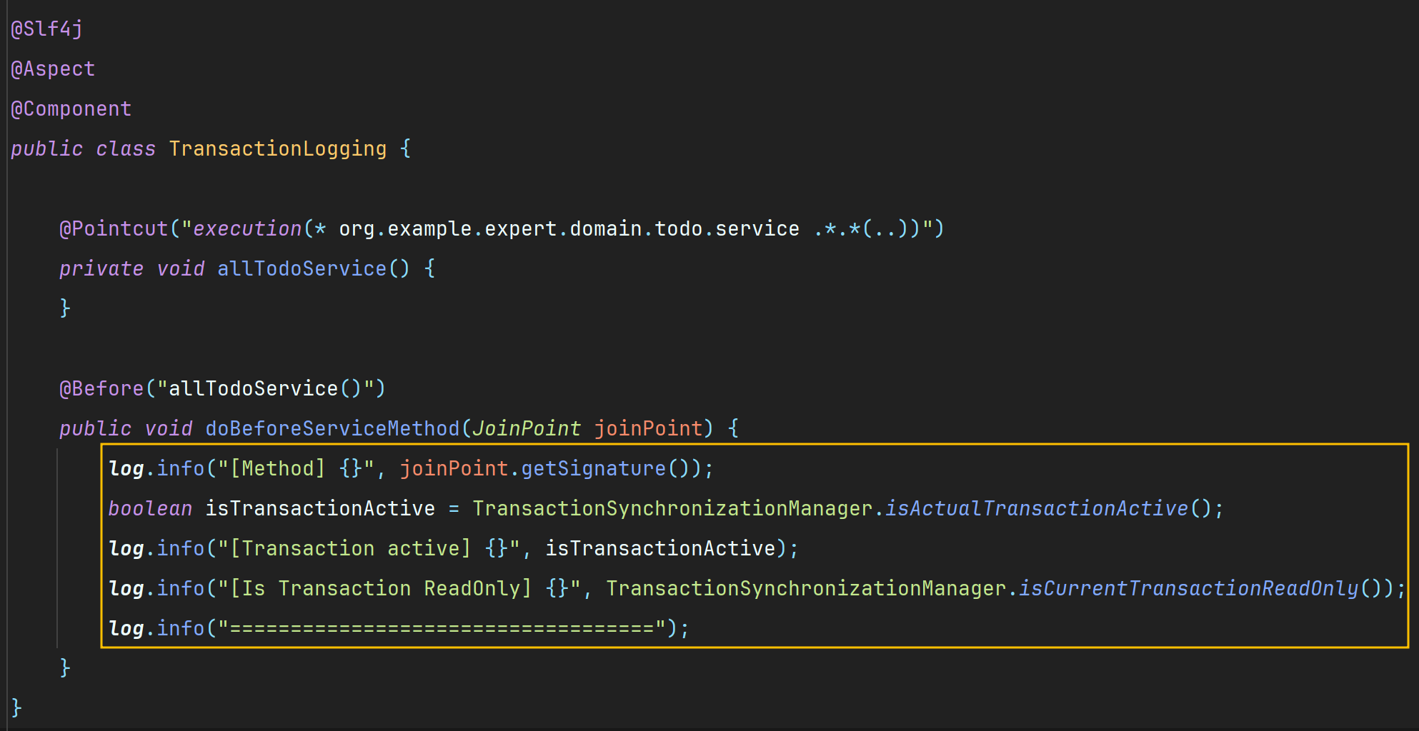 포인트컷을 사용해서 TodoService 클래스에 AOP를 적용하고 saveTodo()를 실행해보면 아래와 같은 로그가 출력된다.
