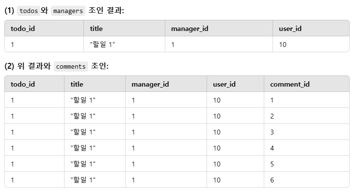 라고 했을 때 manger 와 comment, user 그리고 todo 를 join한 테이블을 그려보면 다음과 같다.