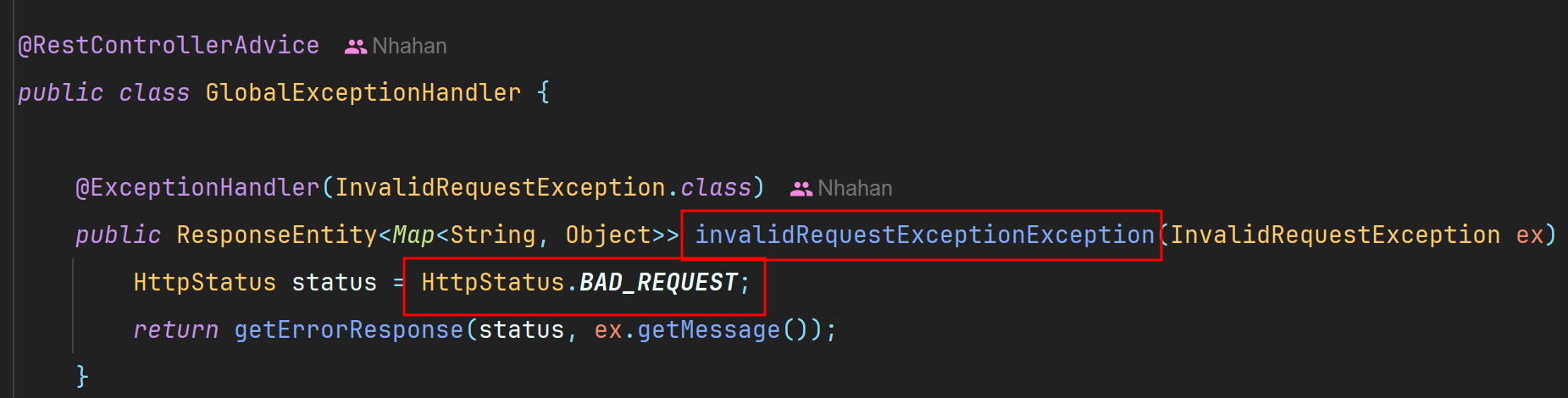 다음으로 InvalidRequestException이 어떻게 커스텀되어 사용되고 있는지 알기 위해 GlobalExceptionHandler를 살펴보았다.