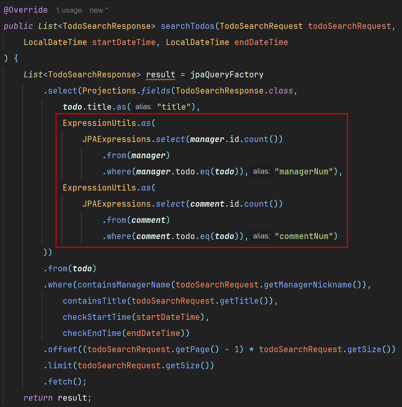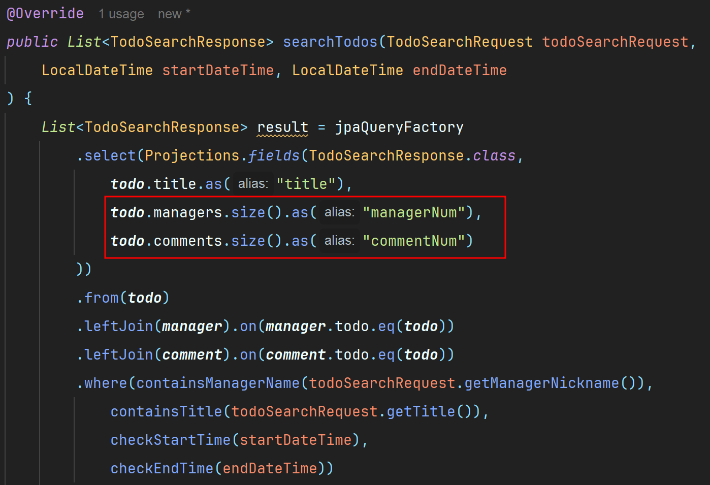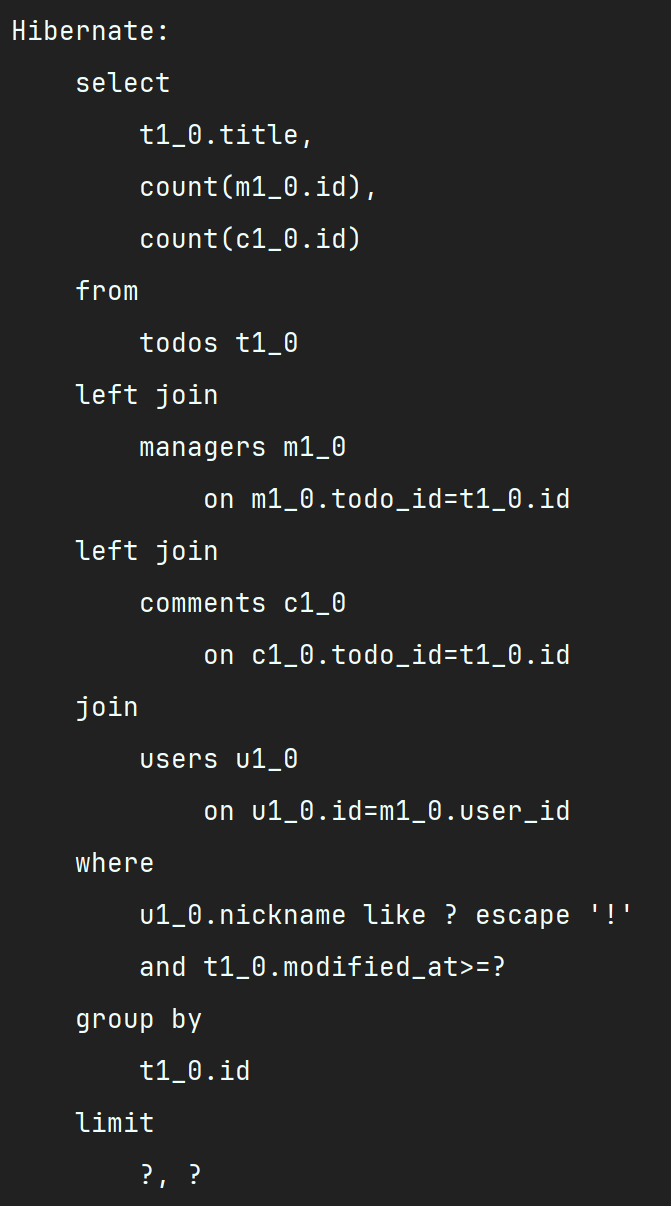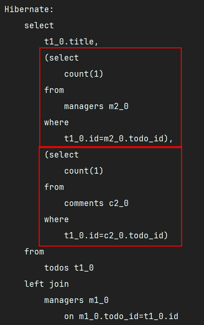 찾아본 바에 의하면 todo.managers.size()와 todo.comments.size()를 사용하면 Hibernate가 이를 처리하기 위해 내부적으로 서브쿼리를 생성하기 때문이다.